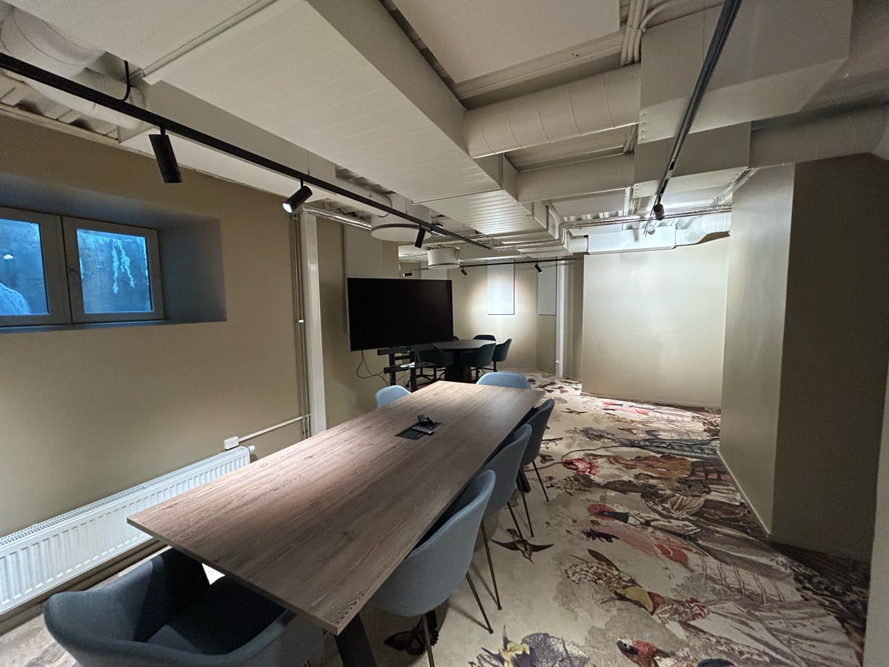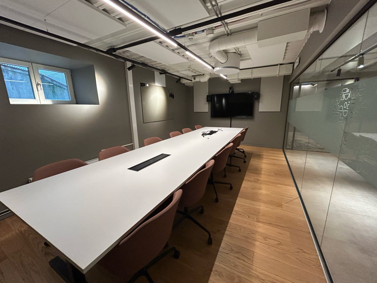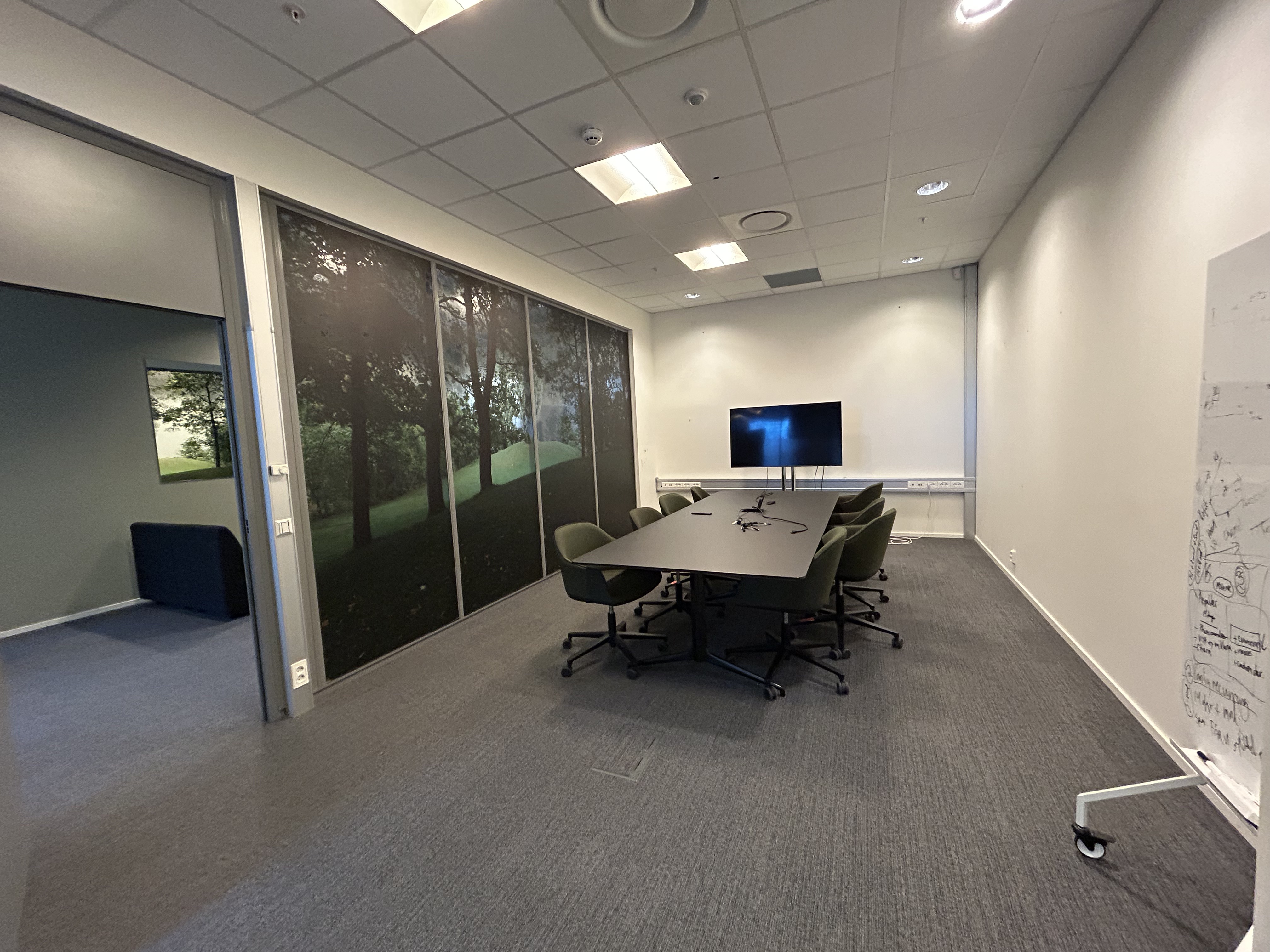 Stort møterom for 12 personer. Utstyrt med TV på vegg m/ kamera og høyttalere for konferansemøter.
