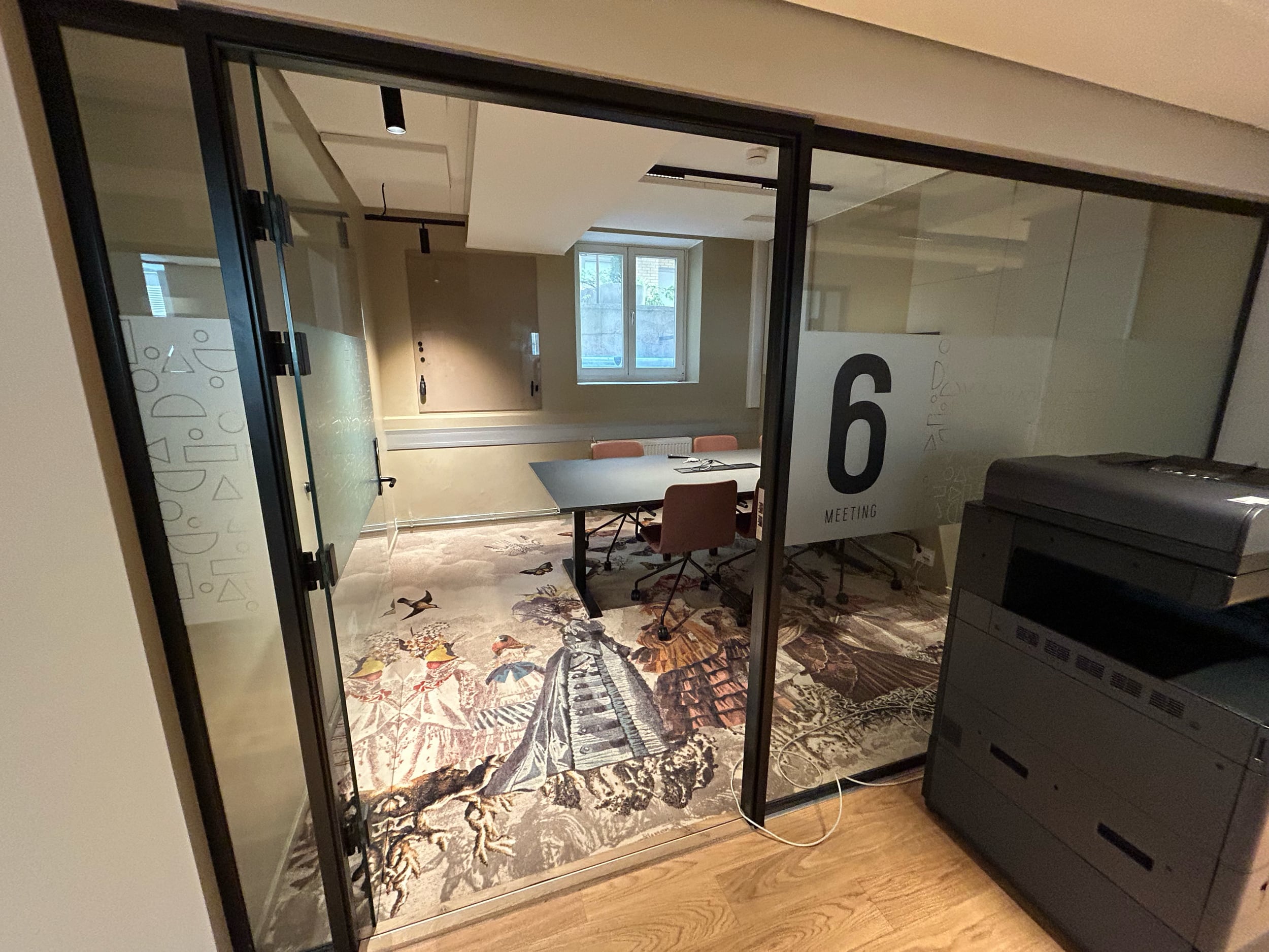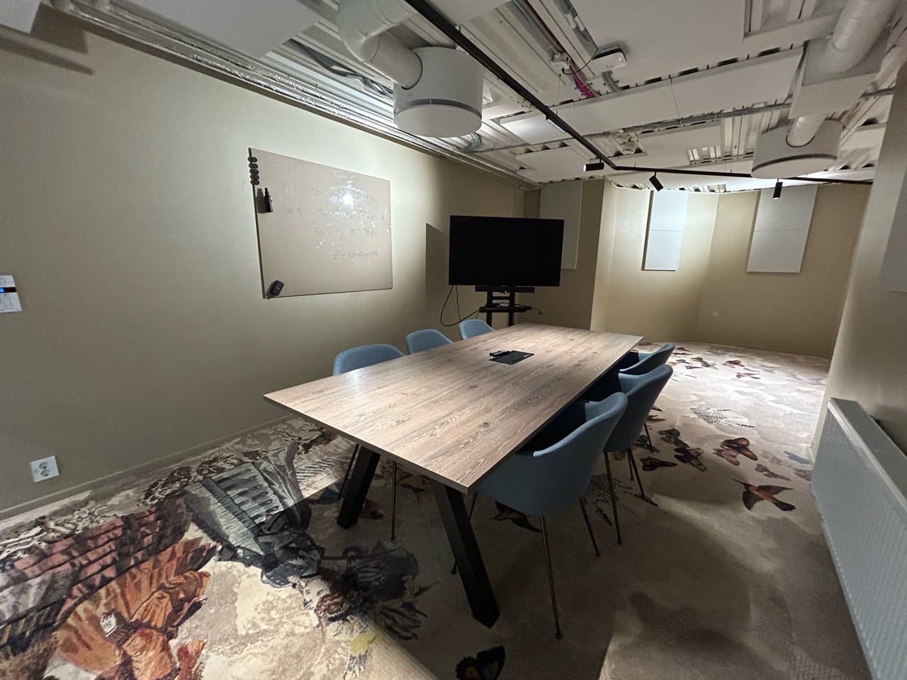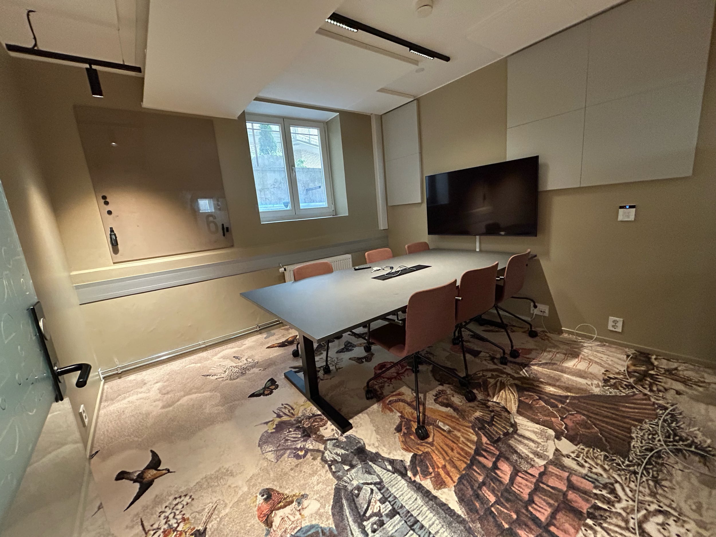 Stort møterom i tårnrommet til 6 personer. Flyttbar TV for presentasjoner, og whiteboard på vegg.